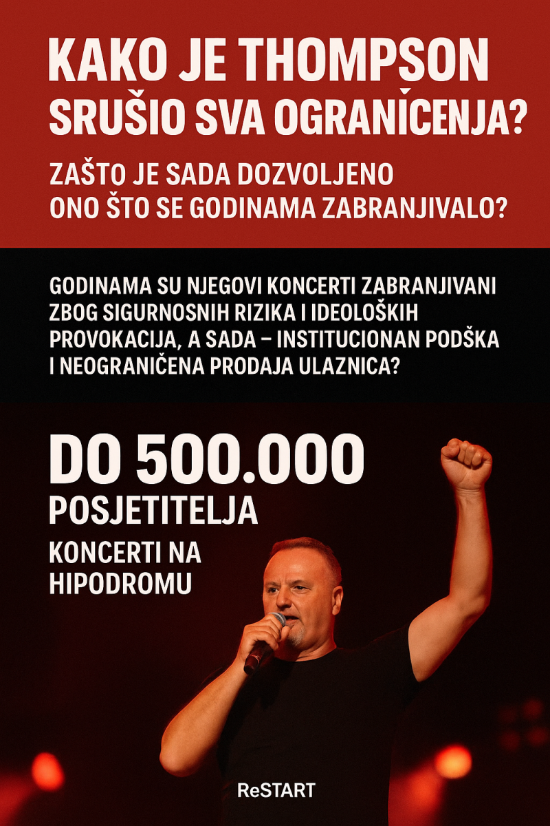 Thompsonov koncert na Hipodromu nije samo glazbeni događaj – on je simbol institucionalne promjene pristupa, ali i ogledalo odnosa politike, sigurnosti i medija prema neugodnim ili “nezgodnim” pojavama. Dok su ranijih godina zabrane bile česte i medijski opravdavane, sada se na tisuće ljudi dopušta bez ikakvih ograničenja, bez odgovornosti i bez analize.